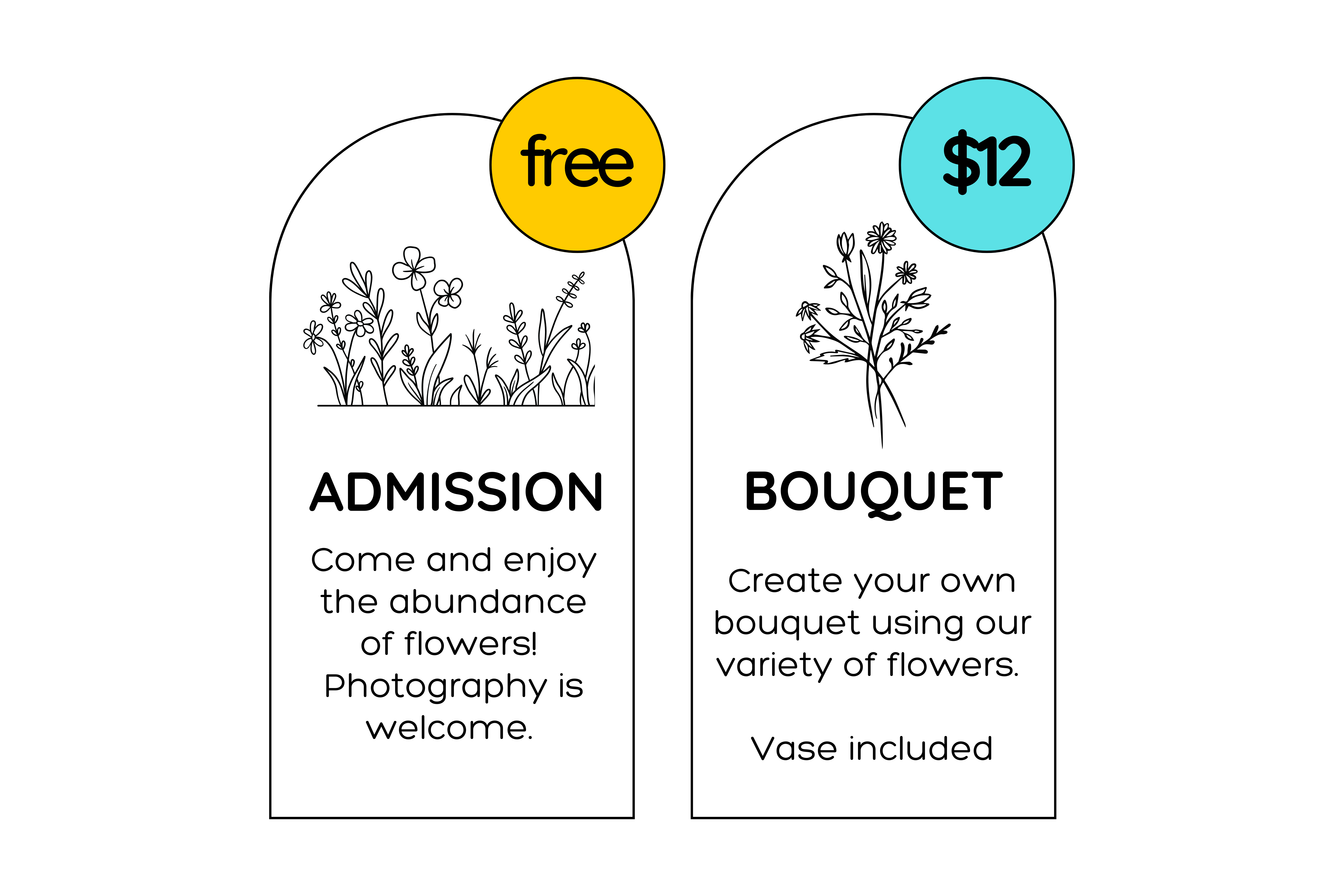 Our U-pick bouquets are $12 each and include one mason jar vase. You’re welcome to explore our entire flower field and choose any flowers you like to create your arrangement. Fill your vase with your favorite blooms and design a bouquet that’s uniquely yours!